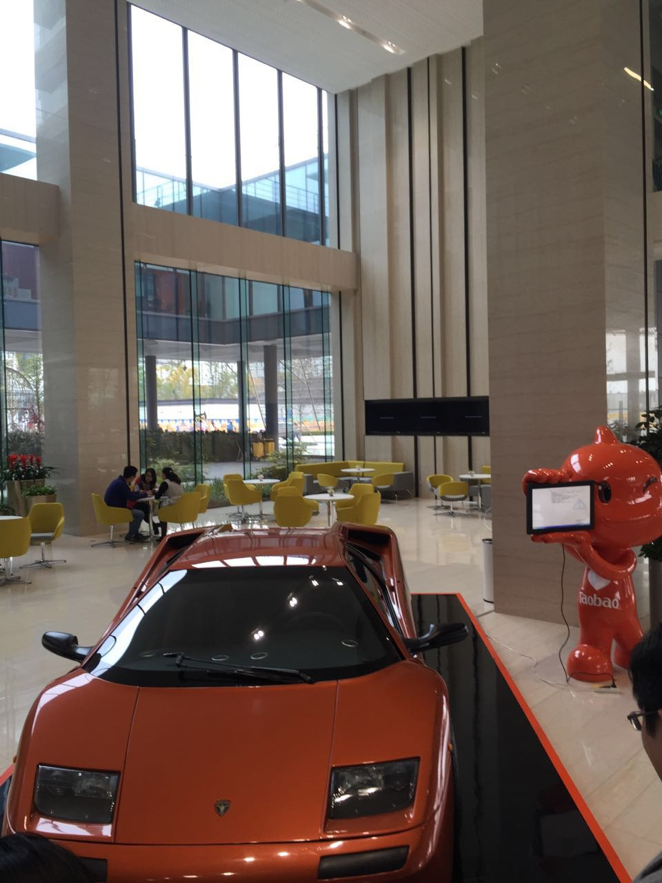 大厅里还放了一辆兰博基尼,据说是淘宝买家用淘宝上买来的东西拼装起来,送给阿里的