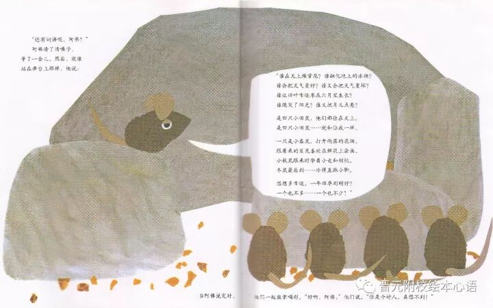 因此,我觉得不仅要感谢诗人阿佛,给平凡的生活缀以色彩,更要感谢和佩服他身边的四个田鼠伙伴,正是由于他们的包容(而且还是在不理解的情况下),允许阿佛在本该忙碌的季节“空想发呆”,允许阿佛在冬日的石缝里“不劳而获”地享用食物,才让阿佛有了展示才华、大方光彩的一天。