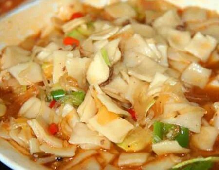 羊肉尕面片:每一个青海人最不能忘怀的,也是最喜爱的面食当然是“羊肉尕面片”了。离乡背井的莘莘学子一回家就是“羊肉尕面片”;刚刚从海外归来的导游一落地便是一碗想念已久的“羊肉尕面片”。为什么这羊肉尕面片让所有的青海人这般心心念念呢?这是与它的精美的制作分不开。首先是和面。将手洗干净,准备一个干净的盆(或者案板),将凉水与面粉按照大约1:3的比例进行调和,将面揉成团,如果太干,就一边揉面,一边加一点水,继续揉,面不能粘手,一直揉到面中有小泡泡,表面十分光滑,用器皿包裹严实,不能让空气进入,静置20分钟。期间,可以进行第二部:炒羊肉。将准备的羊肉切成片(最好如指甲盖一般大小),锅里油热,放入葱花、花椒八角和干红辣椒,然后放入羊肉片炒,羊肉变色后放入少许老抽上色,加入切丁的胡萝卜或者洋芋片,放盐,炒干后,加一定量的水,等待开过;等待期间可以进行第三部:切面搓条。将面团分成几份,每一份揉成长条,按扁,手上抹油,一手拿着面条,一手揪面片儿,然后随手将揪出来的面片入锅,直至所有面条都变成面片在锅里翻滚;当所有面片入锅后,打入一勺凉水,在次沸腾两三分钟后,就可以出锅。