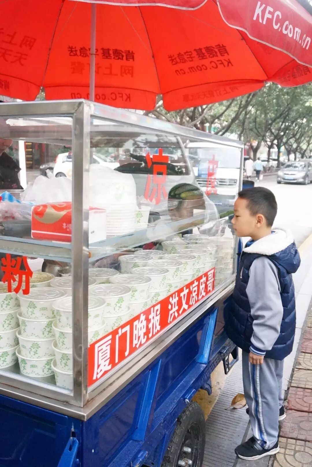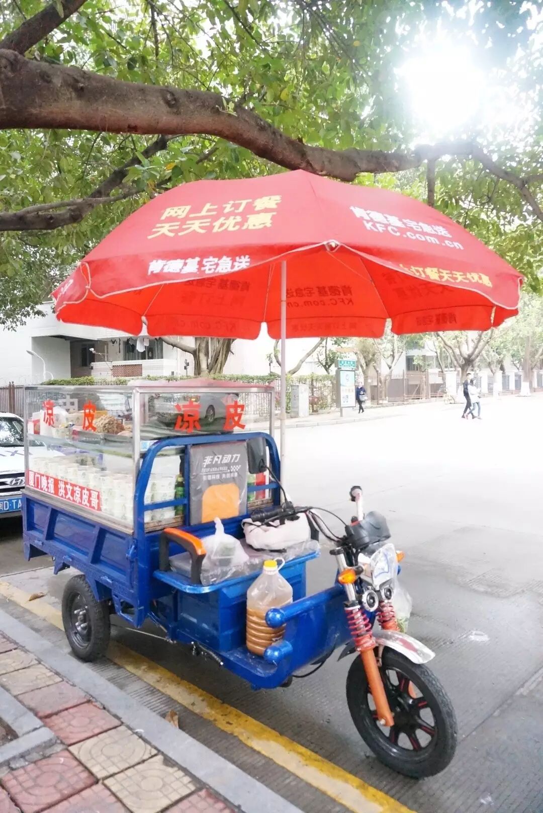 久而久之,这家凉皮的名声越来越大,又因为恰巧摆在厦航宿舍门口,不知是谁给它取了个名号——虏获厦航空姐空少芳心的一碗凉皮。而这辆小三轮车的老板,就被叫做凉皮哥。