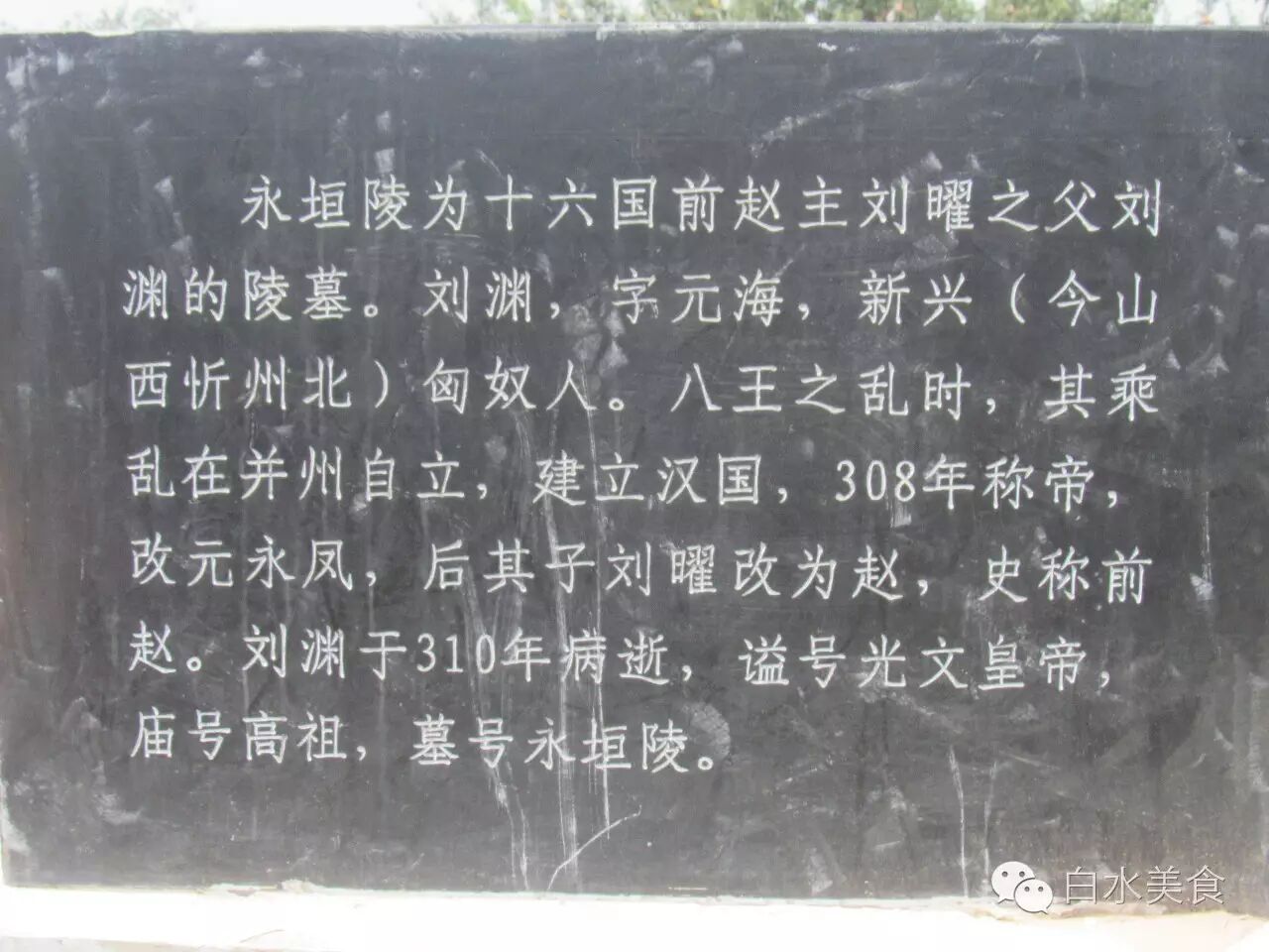 第一站: 白水美食西北乡人文行走进林皋北赵尧村永垣陵!白水处于渭北高原,距汉唐时离长安城较远,在选择陵地时,不为历代统治者所看重唯独永垣陵是个例外。早在316年,前赵皇帝刘曜部将平西将军赵染攻袭长安时,刘曜就来到过粟邑(今白水)对此地情有独钟。其父刘渊葬于此!阿文对南北朝这段历史以及北朝前赵的建立及刘渊的史功做了简单介绍,并带大家参观了永垣陵的周围,大家对对帝王将相陵墓的风水有所了解后,都对永垣陵的人文承载所震撼!