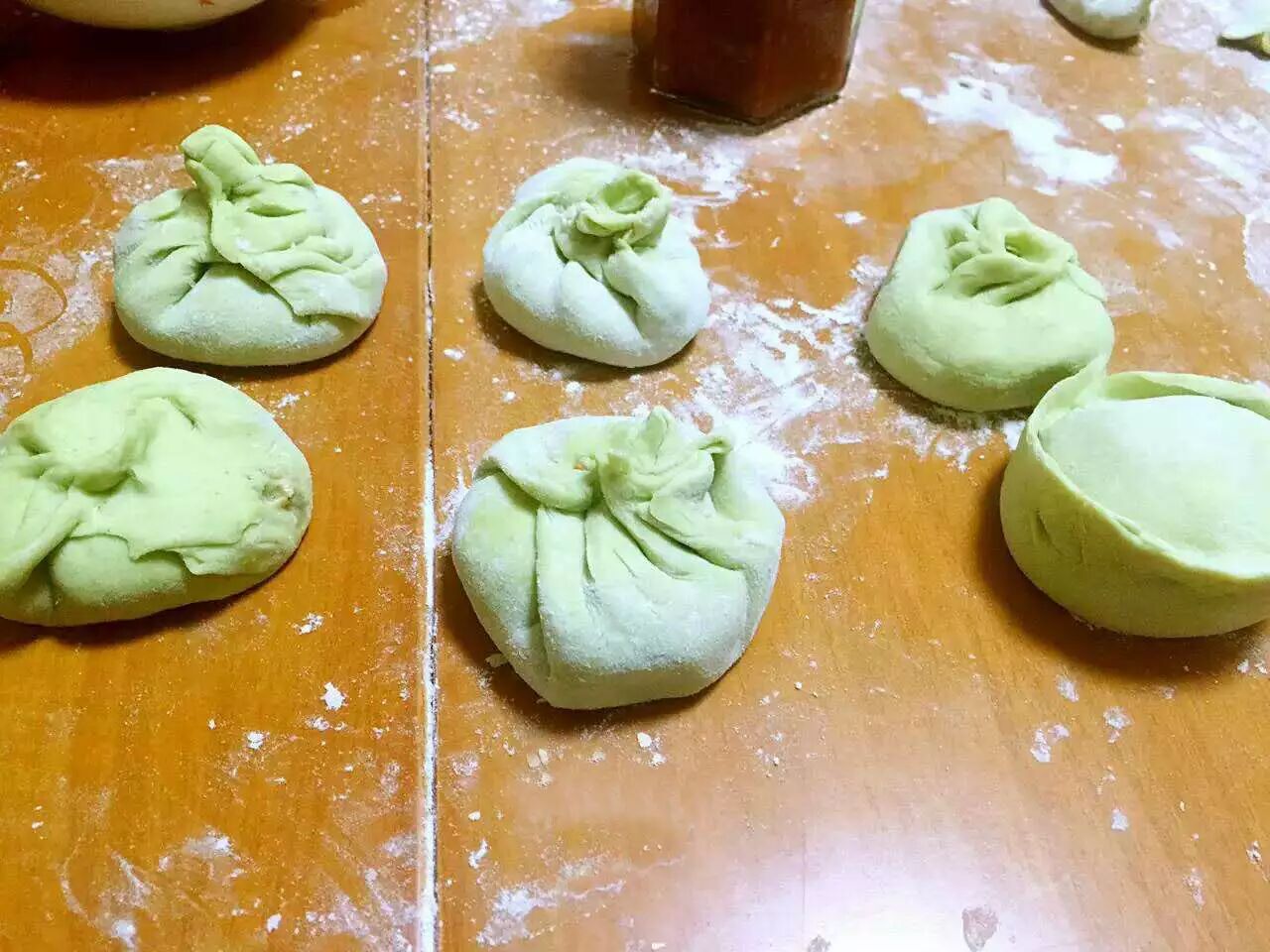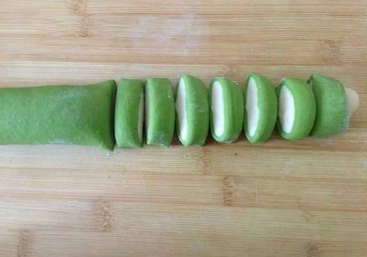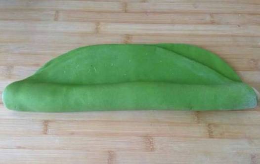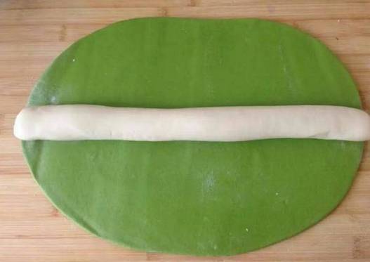 将菠莱水和好的面擀成片,把清水和好的面搓成条。