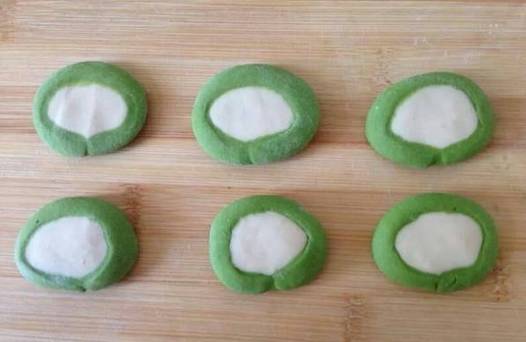 4.把干油酥和水油酥分成两等份,把其中一块水油酥加少量的红色素揉成面团(呈粉红色),再把两块干油酥分别包入两块水油酥内,稍按,擀成长方形薄片(约3毫米厚),从上向下卷起,卷到头后用水粘住,呈筒形状。再分成每个12.5克的面剂,把小剂按扁成皮,粉红色剂皮,打入莲茸馅,包成饺子形状;白色剂皮打入椒盐馅也包成饺子形状。把两色饺子并在一起,边缘锁上花边即成生坯。