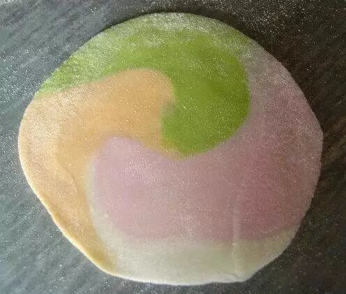 把每一个颜色的面团都搓成圆棒型,然后把所有圆棒面团并在一起,再搓成圆棒型,一个个切开后,就变成了这样。