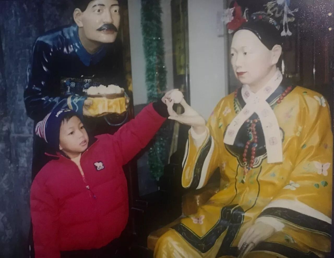 在那发生了一件事。在一家汤包店前有慈禧太后的塑像,我让jack装着去拿慈禧手上的汤包的样子,摆拍一张照片▼