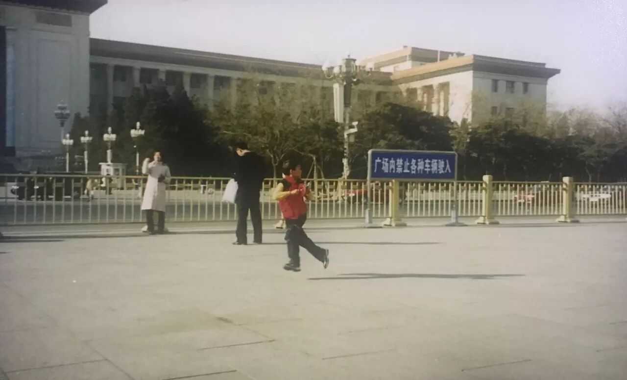 在空旷的天安门广场上,两个大男孩被一个小屁孩弄得手足无措。