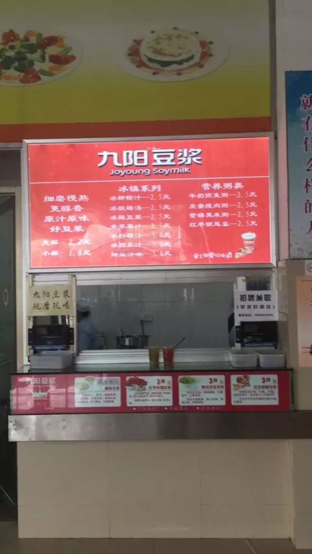 豆浆,中国汉族传统饮品。将大豆用水泡涨后磨碎、过滤、煮沸而成。豆浆营养非常丰富,且易于消化吸收。只要3元钱,在一食堂你就可以喝上现磨的新鲜的豆浆。