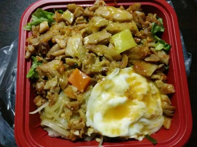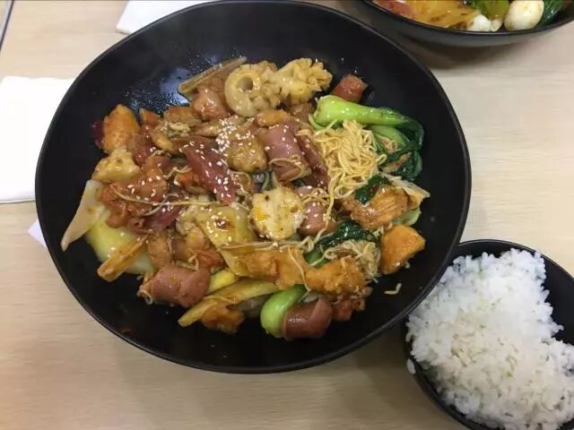 我们学校的烤肉饭主要由土豆,烤肉、青豆、玉米、加入一定辅料和调料后拌制而成。