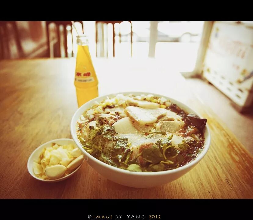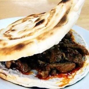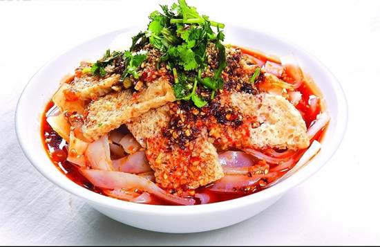 汉中凉皮 因产于汉中地区而得名。由于加工时用小石磨加水将米磨制成米粉浆,又叫水磨凉皮。制作时,将磨砀米粉浆平铺于竹蒸笼上蒸制。加入调料,主要是蒜汁、辣椒油、口味酸辣之中透着蒜香。