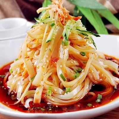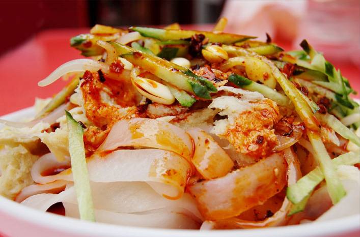 陕西凉皮种类繁多,做法各异,调拌时各具特色,口味也不同,在这里,仅举出几种。