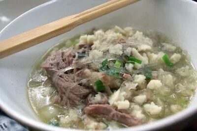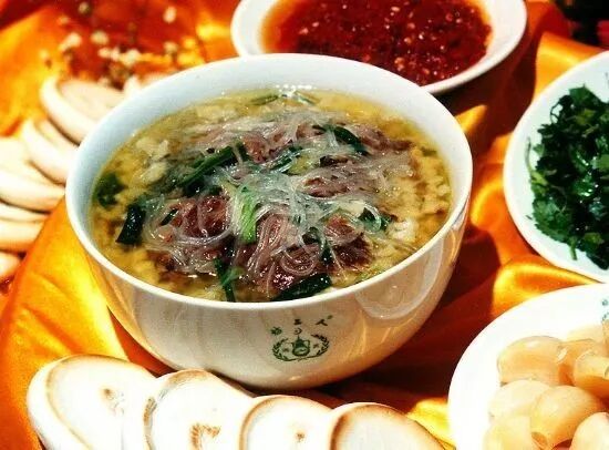 麻酱凉皮 一种典型的清真吃法。其做法较简单,把面粉调成糊状,盛入特制的金属凉皮箩里,摇支凉皮萝使面精平平地铺在箩底,然后放入开水锅内蒸制成熟。吃时,把面皮切成半厘米宽的条,一般加辅料为黄瓜丝,调入盐、醋、酱、芝麻酱、辣椒油等即可。