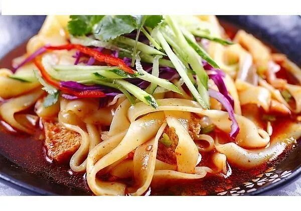 岐山擀面皮 岐山县制作的最佳。制作时,将小麦粉洗出面筋,把淀粉擀成薄饼,上蒸笼蒸制。制成凉皮既软又粘。调料以岐山当地酿制的粮食醋和辣椒油为主,辅以洗出的面筋丝,在一小铁锅内拌合均匀,盛盘而飨客,其口味主要特点是酸、辣、香。