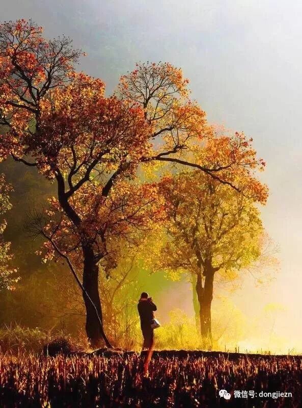 清晨时,在柔光的照耀下,红叶鎏金、,轻装红瓦的村庄,偶尔在此休息的黄牛,一幅岁月静好的模样,美醉成画。