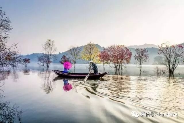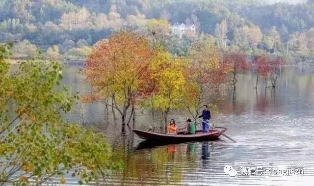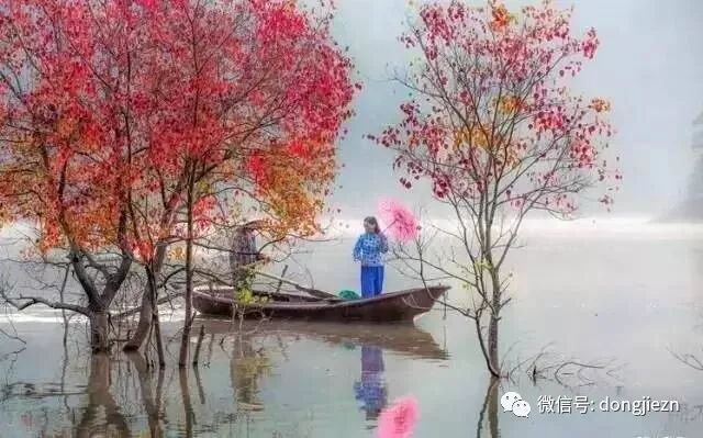 红叶倒影在水中,十分和谐,若是清晨,浓雾弥漫在水上,缭绕在乌桕周围,不时有渔民撸桨划舟经过,穿梭在红叶之间,就如仙境般诗意。