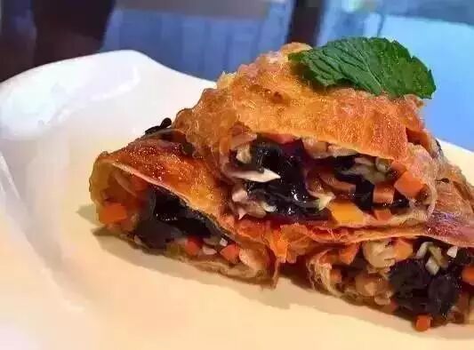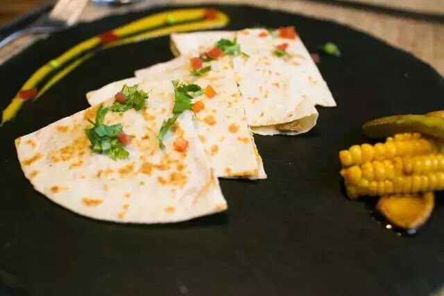 辣味儿墨西哥饼配烤蔬菜干脆的饼子里面夹着香菇和杏鲍菇,切得细碎再经翻炒来作馅,旁边还有酸辣酱可以搭配食用。