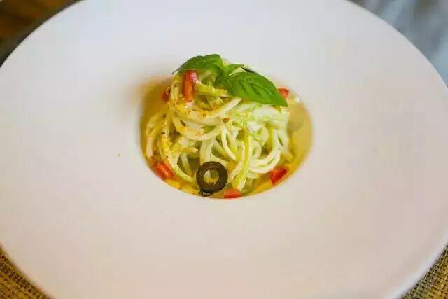 墨西哥烤饼蔬菜面不是真的面,而是节瓜刮成长条形成为面条的形态。干果搭配,柠檬提味,吃起来口感清脆,富含维生素。