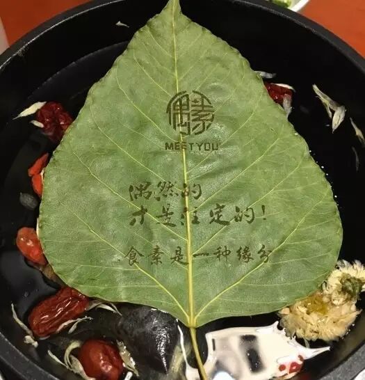 锅底是茶汤,加了些红枣、枸杞以及别的材料,汤面上还漂了一大张菩提叶,吃完后可以让服务员清洗后拿回家做书签的。最近偶素在搞活动,有些很划算。可以去试试哒!