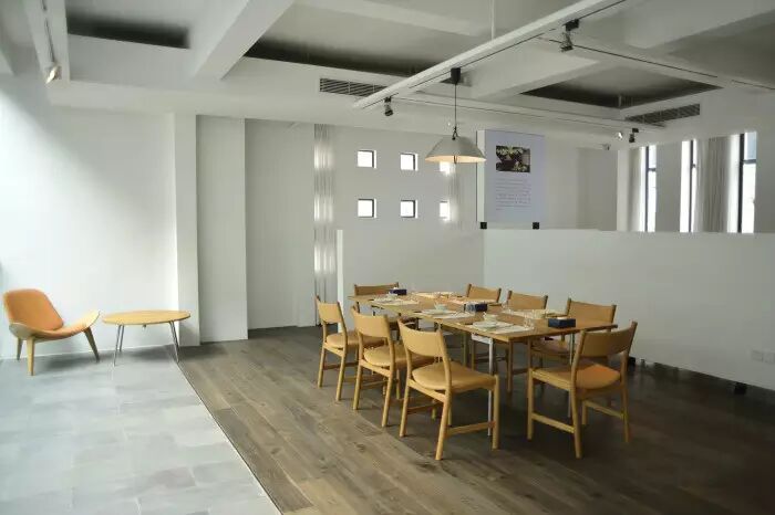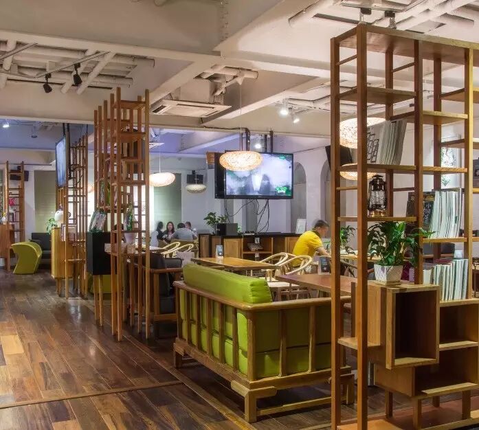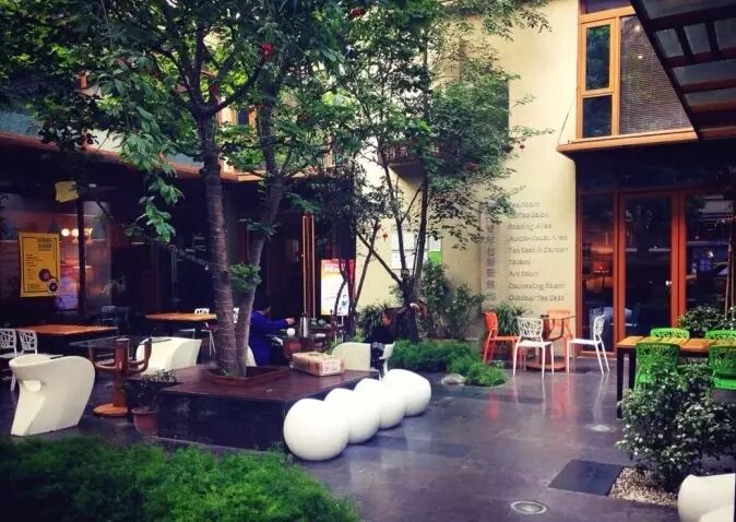 墙上写着“现代青年创新聚集地”,外面看起还以为是咖啡馆,闹中取静,环境相当好。分室内室外,室内古风一点,以木制和布艺为主,大方简洁; 室外更加现代,很通透,待太阳落山坐在外面喝茶一定很舒服。