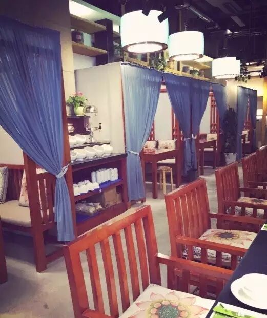 素食餐厅洁净、整齐是必须的,质朴无华的水泥地。一排单人料理吧台,另一边木质卡座+蓝色纱幔,小私密哦。空间里播放着轻柔的古琴乐曲,静谧、安然里又带着一些文艺小资范儿。