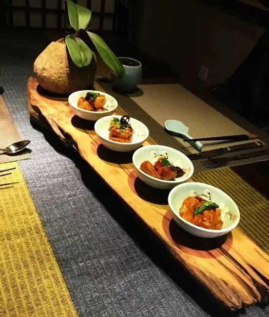 怀石料理,专门从台湾请大厨来做,每一道菜绝对不允许有一点瑕疵,非常精致。一人一套,按照健康营养学的顺序上的菜。