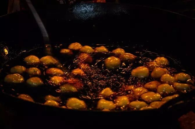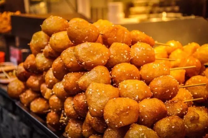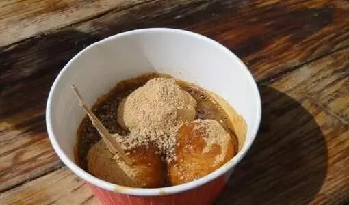 糯米粉炸制而成,外面裹上焦糖撒上芝麻。最好是一半空心一半实心,咬起来一半脆爽一半黏牙。