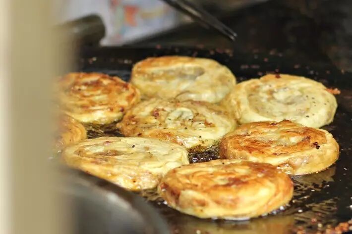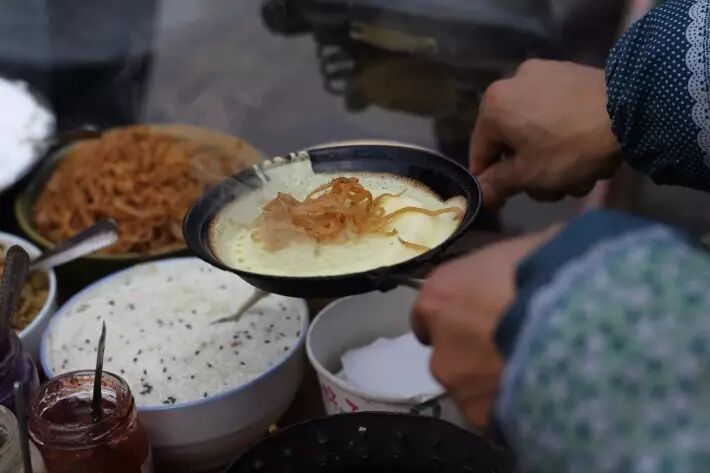 在成都最爱吃的小吃,只要找到一个带着两个炉子加两个小铁板锅的小推车你就能吃到地道的成都蛋烘糕。外皮是鸡蛋和牛奶调制的,馅儿的选择很多。