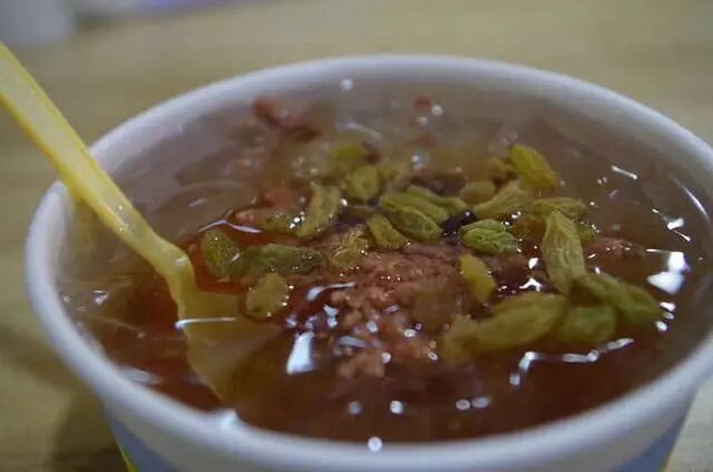 夏季解渴必备,滑溜溜的冰粉加上红糖、山楂、葡萄干、花生碎、再来点碎冰,吃火锅烧烤的绝佳搭配。
