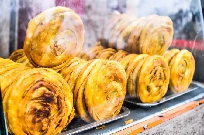 锅盔是将夹着肉馅儿的面饼放到油里煎炸,之后放到炉火中烤制,吃起来非常香酥可口。和肥肠粉是绝佳搭配,吃了一半的锅盔泡到粉汤里,这滋味只有吃过的才知道。