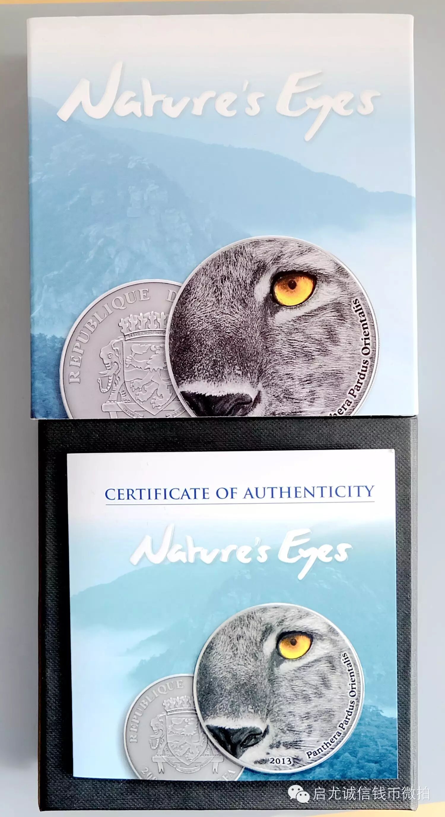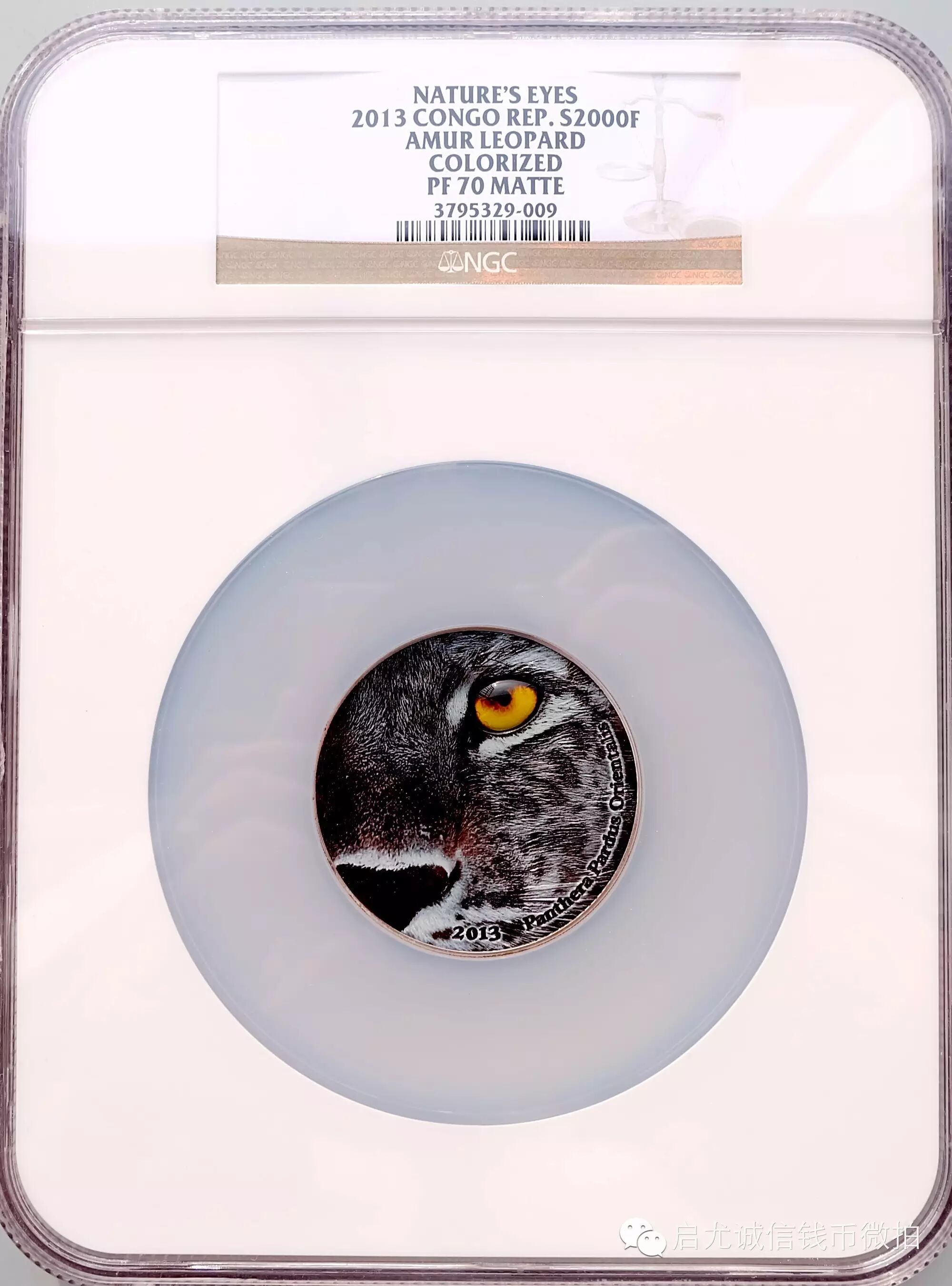 【拍品介绍】:NGCPF70MATTE2013自然之眼远东豹仿古彩色纪念银币一枚,面值:2000中非合作金融法郎,材质:999银,重量:2盎司,发行数量999枚,非洲动物之眼首枚,仿古彩色银币,入围2014年俄罗斯银币之星奖项评选,NGC满分币,原盒原证书。