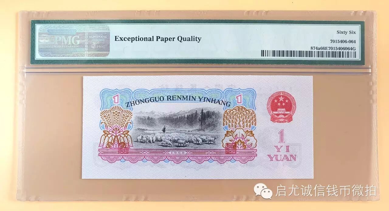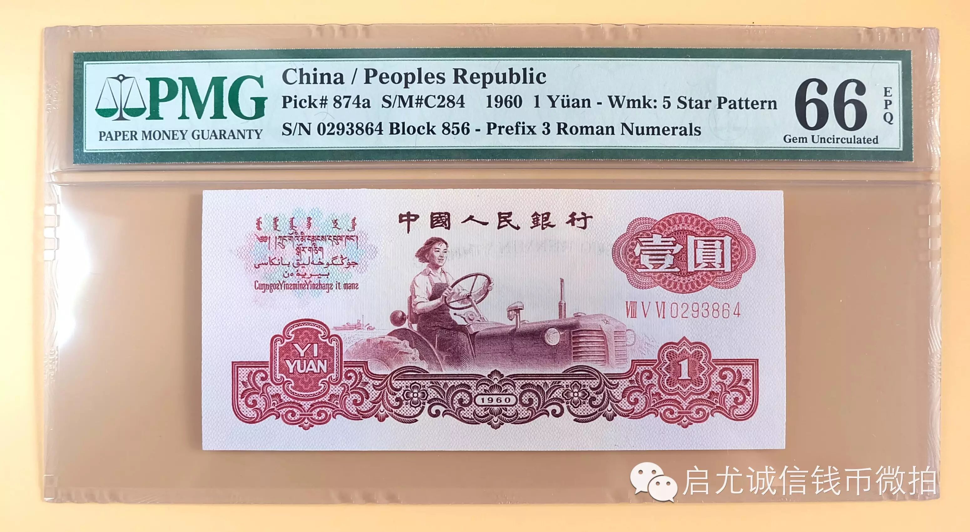 【拍品介绍】:PMG66EPQ五角星拖拉机壹圆一枚,PMG评级66分,五角星水印,三罗七号码,值得收藏。