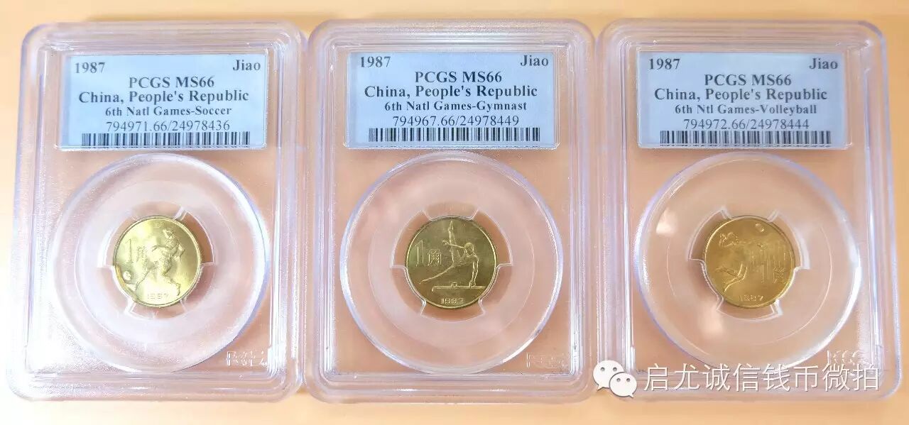 【拍品介绍】:PCGSMS66 六运会纪念币一套,六运会流通纪念币于1987年11月20日发行,全套3枚,面值均为1角。该币为铜锌合金材质,发行量为351万套。