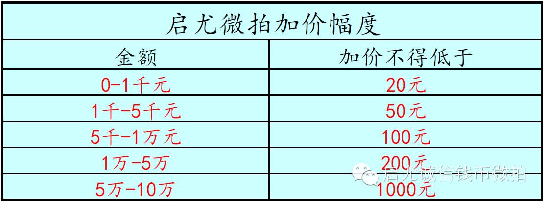 4. 每次加价1000元以内每次加价20元,1000~5000元每次加价50元。5000~10000元每次加价100元,10000元以上每次加价200元。(如有不方便参拍的泉友,可联系启尤钱币群拍卖师代为出价)