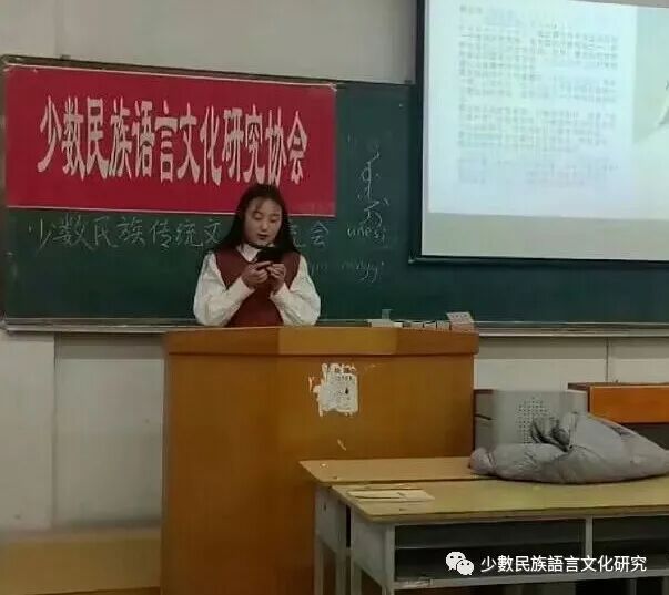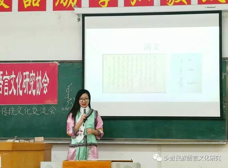 活动一开始,会长满明珠首先上台介绍了少数民族语言文化研究协会的发展状况以及对未来的期待。同时也介绍了满族文化,满族的历史源流,满语的发展现状。鼓励大家学习了解少数民族语言文化,以及民族团结的重要性。她以一首满语的《摇篮曲》,拉开了本次少数民族文化交流会的序幕。