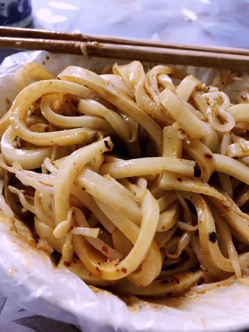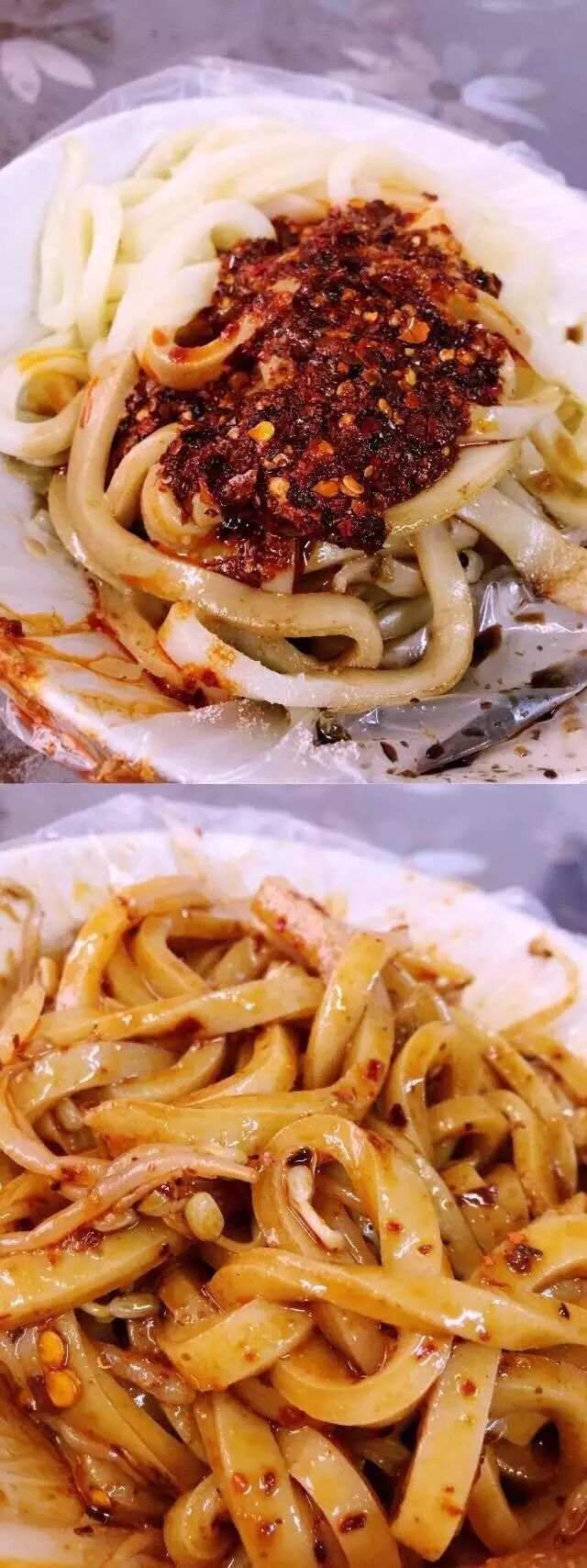 吃的时候小贩会直接将米皮切成筷子般粗细,然后放上调料小菜,最后用勺子挖一大勺辣椒出来,一起淋到皮子上。这样的凉皮咬一口滋滋冒油、鲜美爽口的感觉实在过瘾!