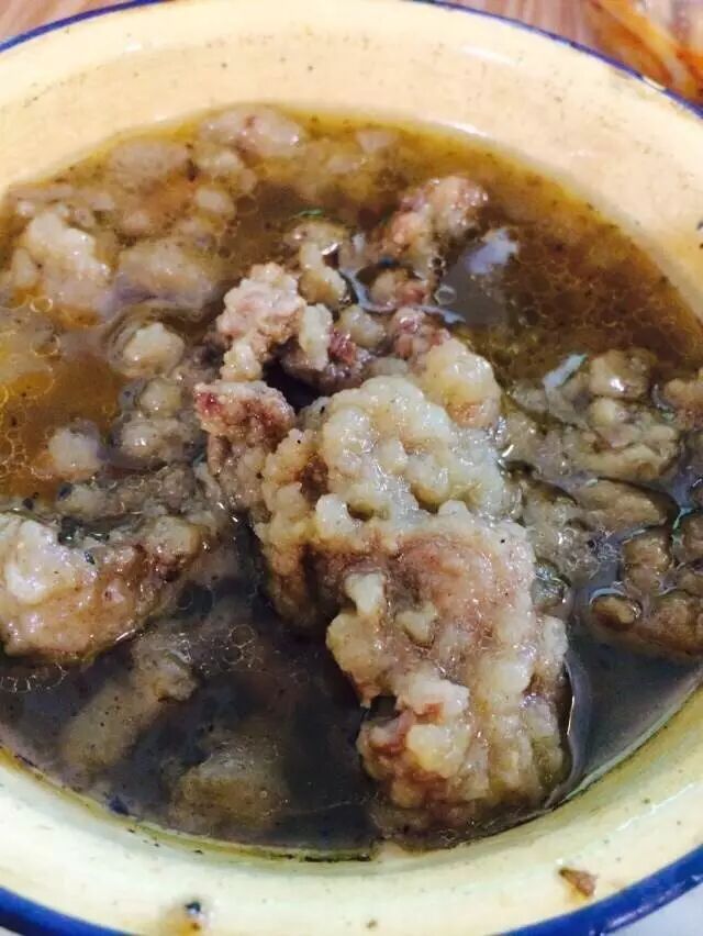 其黄色的小钵盛着小酥肉,肉面上泛着一层金黄色的油,大块大块的肉若隐若现,夹起一块发现肉的外面还裹着一层薄粉。咬一口,滑嫩鲜香,完全不是用味精调制出来的味道。这是,再将肉汁浇到米饭上,再泼上这家的辣子油,淋上芝麻粒,味道香而不辣。肉和饭就着吃,一定吃到肚歪才能罢手。