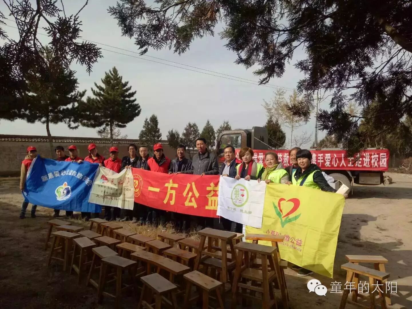 太阳暖暖地照耀校园,操场里爱心志愿者摆好桌子,拉开横幅合影留念。