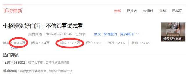 近日,网络上关于“七招辨别好酒”的视频引起了记者的关注。记者发现,该视频的主线是看酒的颜色、闻酒的气味、触摸酒的质感、品尝酒的口感、兑水之后的色泽以及饮酒后第二天的感受,被视频博主总结为“一看二闻三触摸,四品五兑六空杯,推杯换盏待明日,醒来舒畅方是真”。截止到记者发稿前,今日头条的播放量为17.8万,微博的播放量为9万,秒拍的播放量为4.1万,总播放量破30万。