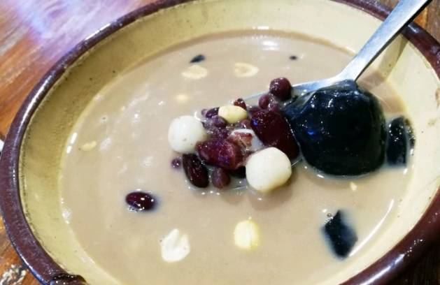黑米做的醪糟,花生碎,玫瑰,糖冬瓜,面上盖一层猪油,冬天吃热乎乎的,里面玫瑰酱、花生碎、黑芝麻等料很足!再加上手工小汤圆,油而不腻,酸甜可口。还美容养颜 。