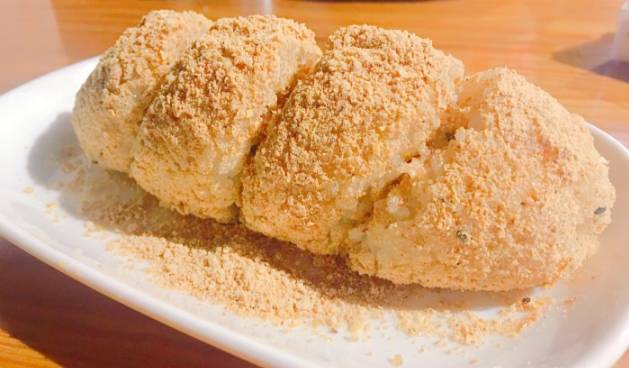 糯米团咸甜自选,手工制作包裹,用的是百分百的糯米不夹杂一丁点大米,软糯Q弹甘香甜,糯米团里的油条根根嘎嘣脆,蘸裹满满的黄豆粉和芝麻糖粉,一个3元钱,吃一个绝对饱,小饭量的可能都吃不完。