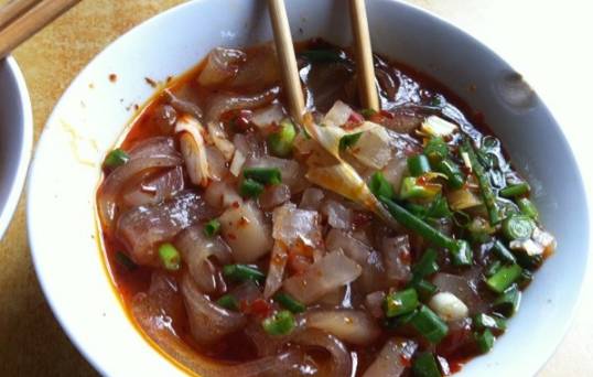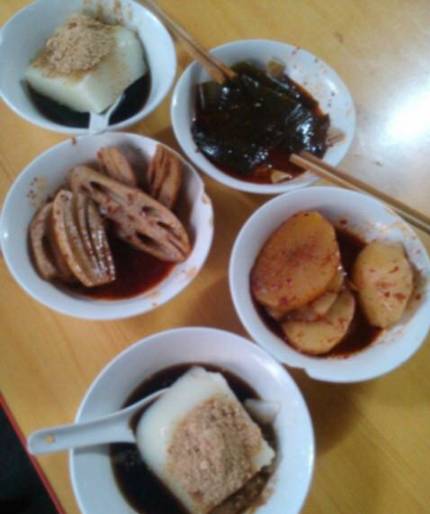 苕皮3元一碗,以前也是2元,现在跟着物价也涨了一元,藕和凉面啊,还有就是海带啊这些,都是3元!一份一份的可以吃很多种。