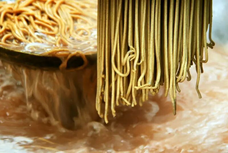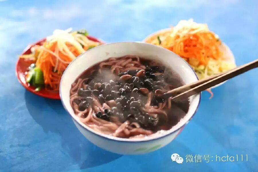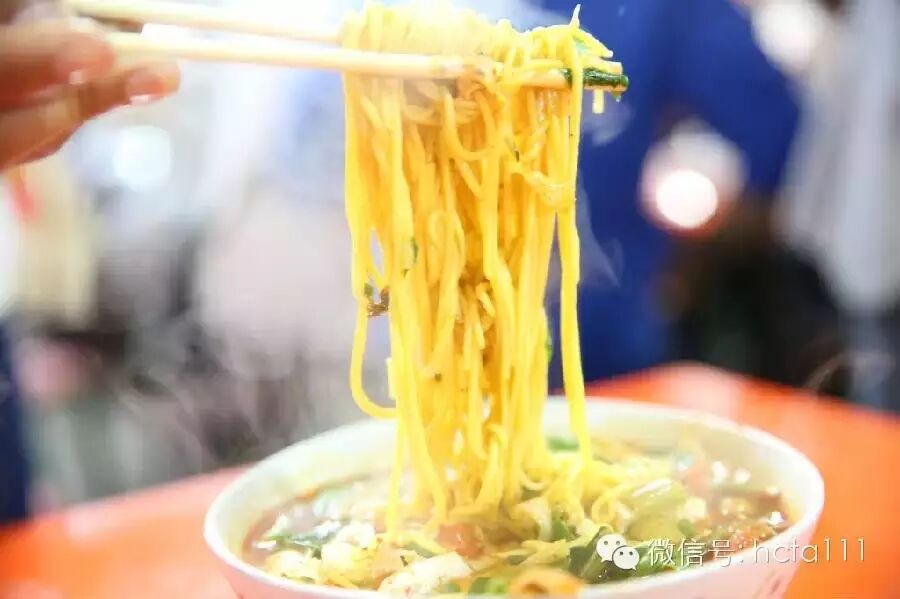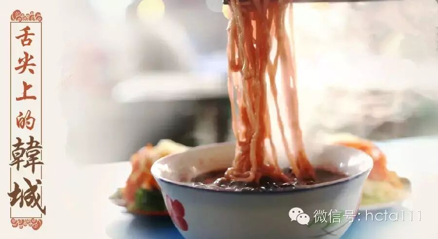 韩城美食——酸菜烩玉米面饸饹。因为颜色为黄色,如钢丝般形状,故而韩城人又把它叫做“钢丝面饸饹”。