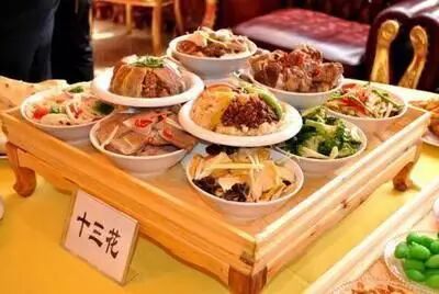 韩城川原户户养猪,逢事请客,必杀猪招待,既经济,又盛情。经过一代又一代的实践,终于创造出了不同形色的猪肉系列菜肴 “十三花”。 “十三花”的制作,是将猪身不同部位的肉,经煮、炸、蒸、烧等工艺分别做成。