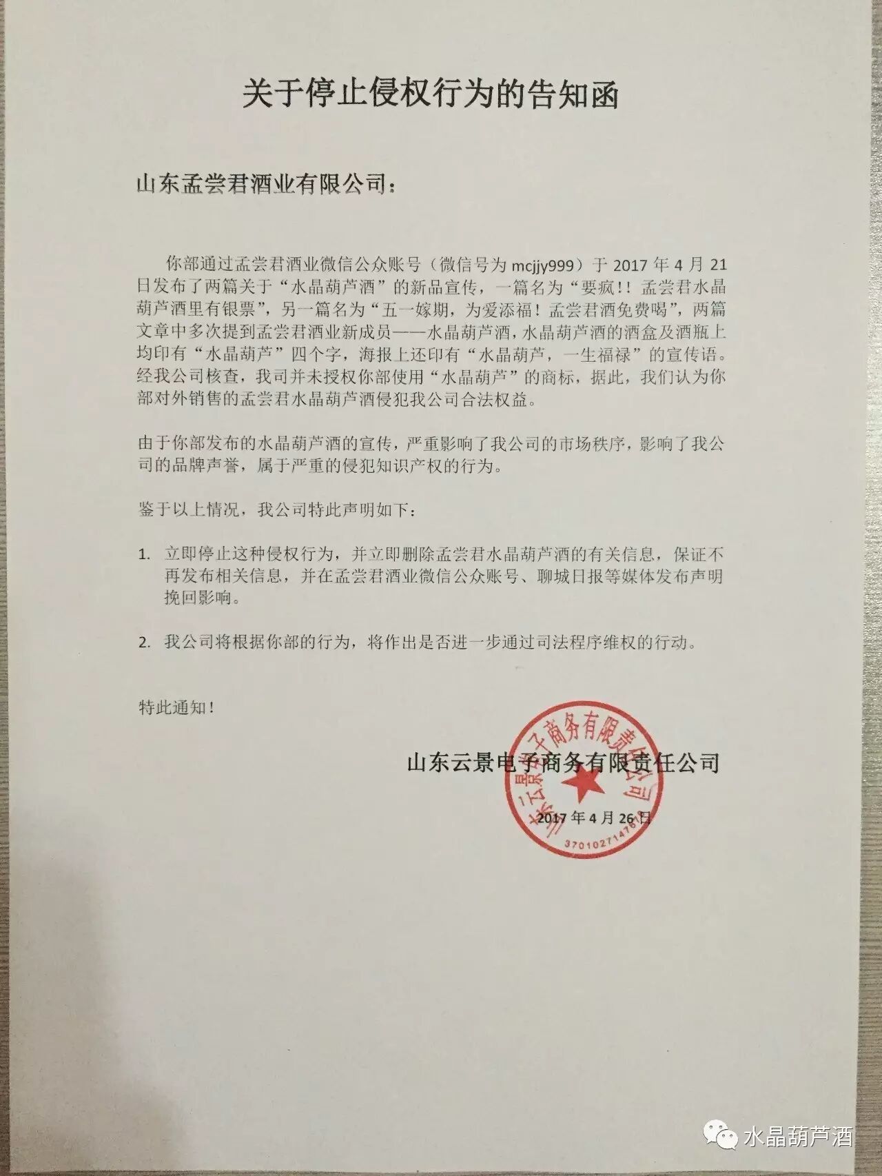 欧阳千里表示,山东孟尝君酒业有限公司等酒企在没有得到授权的情况下,以“水晶葫芦”之名在互联网上进行盈利宣传,严重侵犯到水晶葫芦酒的合法权益。云景电商对33类商标“水晶葫芦”享有排他使用权、收益权、处分权、续展权和禁止他人侵害的权利。他人擅自使用“水晶葫芦”进行赢利宣传的行为,、《著作权法》等相关法律法规,侵犯了云景电商的合法权益,并使云景电商遭受了直接和间接的损失。