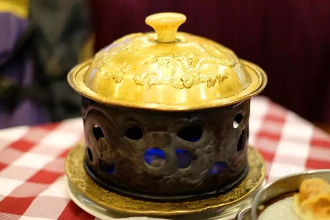 这是一口饺子锅,锅盖很有分量,里面煮着小拇指盖儿般大的饺子,貌似还是鸡肉馅儿的。如果人多,必然吃到的数量就不一样,说法寓意也就不同,服务员在盛饺子的时候会给你讲解。