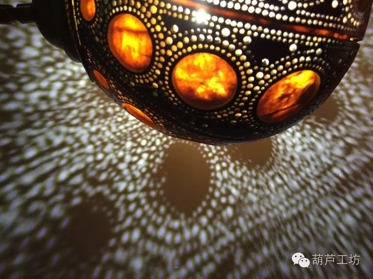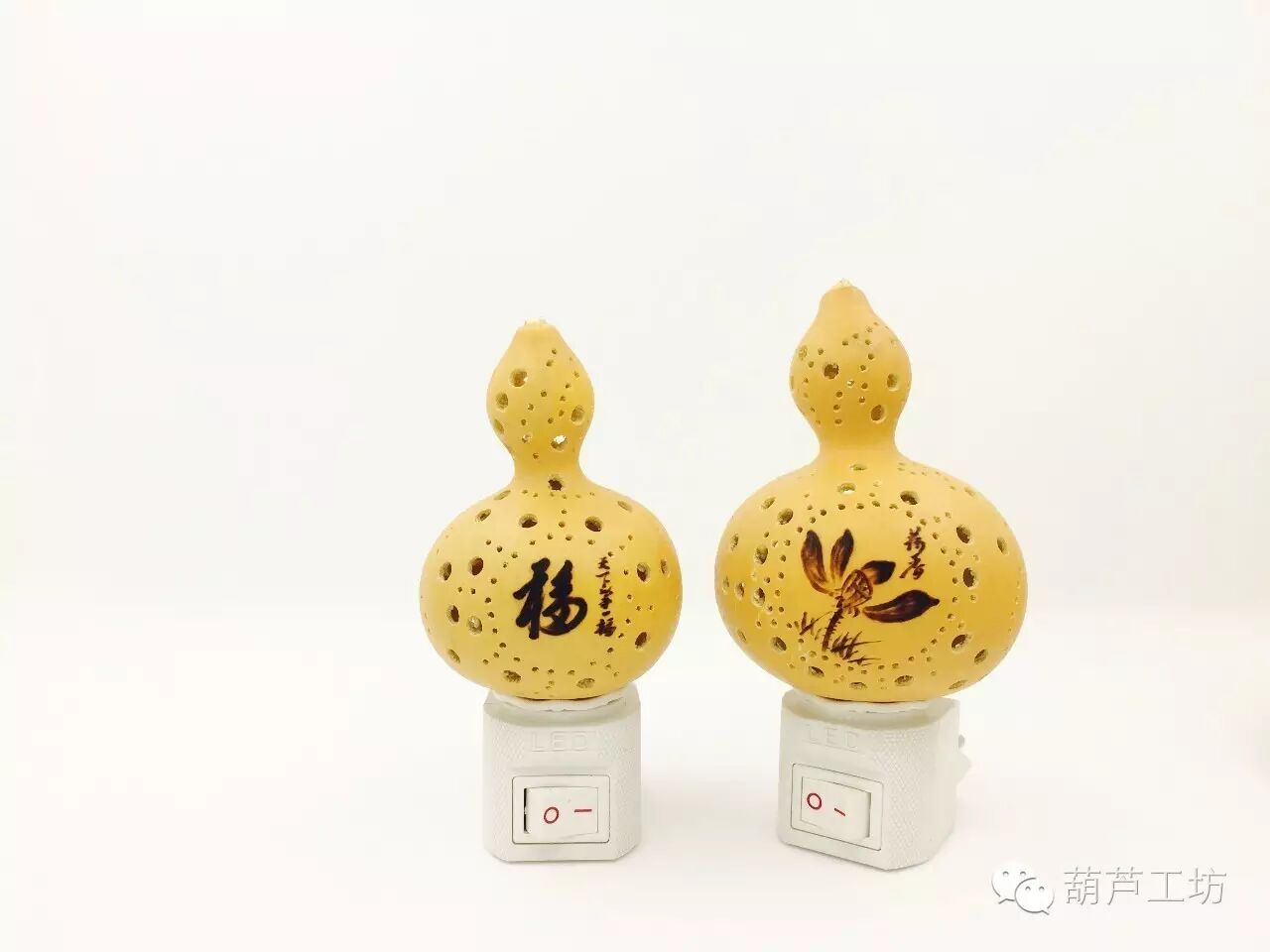 葫芦小夜灯:通过打孔、镶嵌等工艺精心制作。图中的“福”为康熙御笔的天下第一福,通过烙画的形式烙到葫芦上。右边那款为恭王府定制。