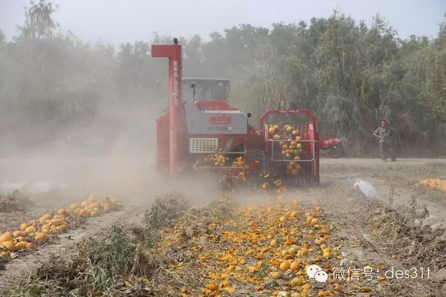 8月31日,在二师31团1连59条田,一台葫芦瓜联合采收机正在采收无壳南瓜。这台联合采收机是从德国引进的,是全疆第一台葫芦瓜联合采收机。