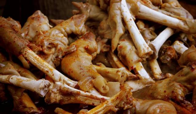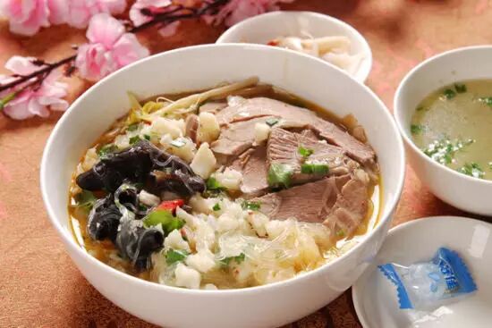 用优质牛羊肉加佐料入锅煮烂,汤汁备用。把烙好的“虎背菊花心”——坨坨馍,掰成碎块,加辅料煮制而成。