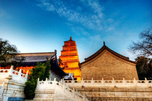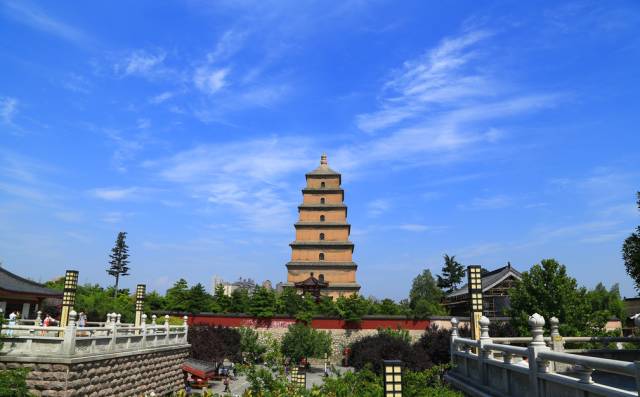唐代永徽三年玄奘为藏经典而修建,塔身七层,通高64.5米,是中国唐朝建筑艺术杰作,登上塔顶,凭栏远眺,长安风貌尽收眼底。
