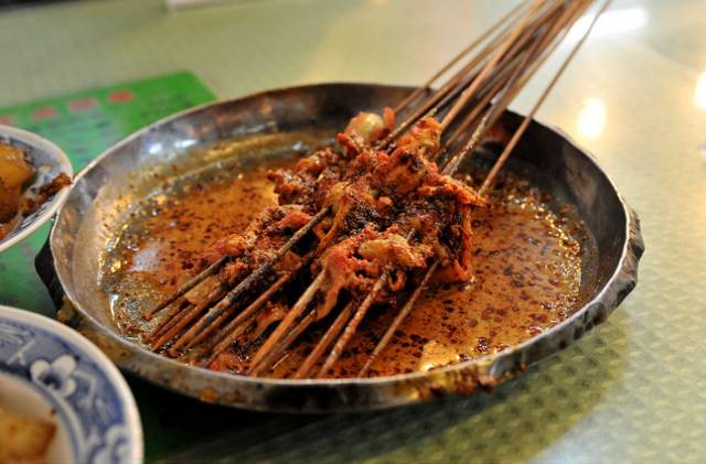 涮牛肚是西安街头名吃,把新鲜的牛肚肉切成片,用竹签穿起来,在高汤里煮熟,然后蘸上由的芝麻酱、辣椒酱、各种调料做成的汁子,浓香筋道,美味又可口。