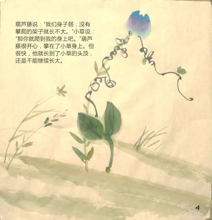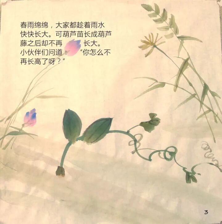 春雨绵绵,大家都趁着雨水快快长大。可葫芦苗长出葫芦藤之后,却不再长高了。小伙伴们问道:“你怎么不再长了呀?”葫芦藤伤心地说:“我们身子弱,如果没有攀爬的架子就长不大了!”